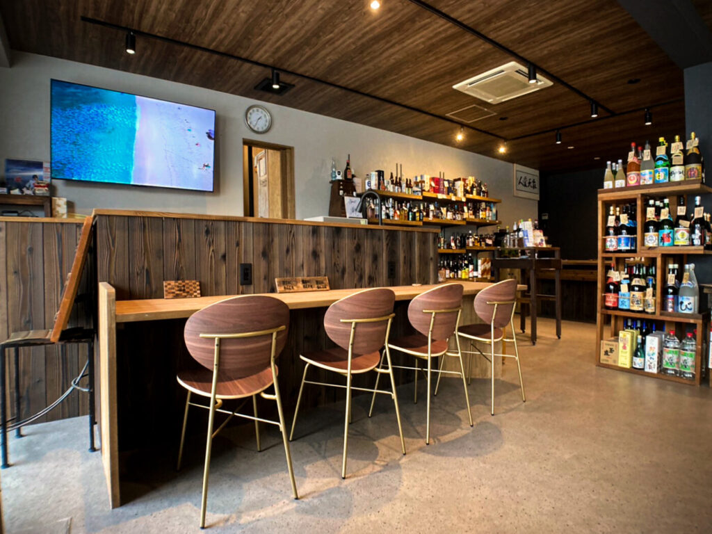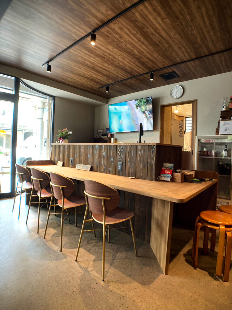 店舗改装を機会に「角打ち」が出来るカウンター席へ、可愛らしいフォルムのチェアとお店の看板ともなる暖簾をご提案させて頂きました。