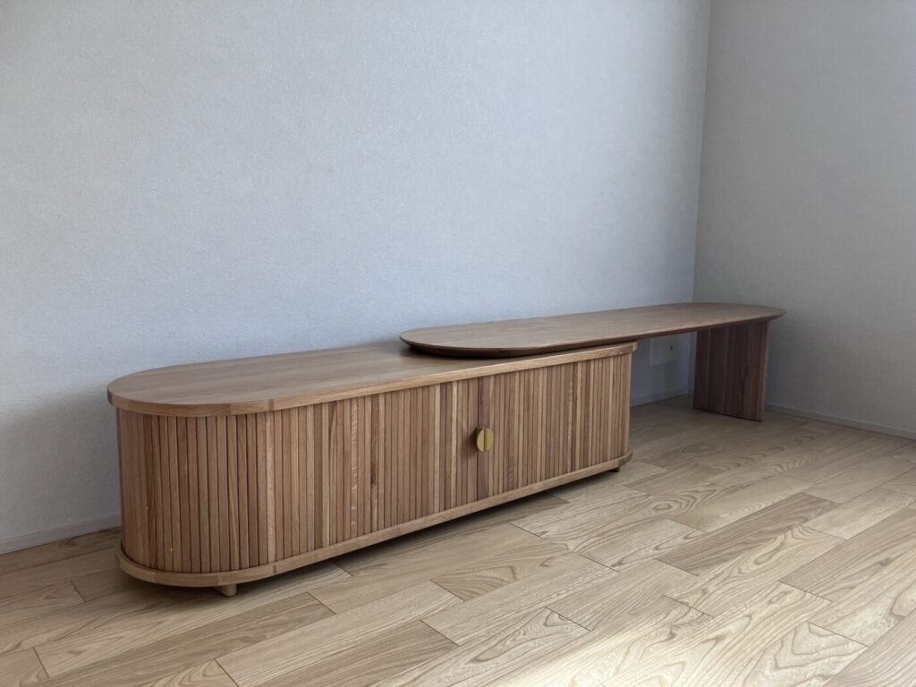 伸縮自由なTVボードは、やさしい丸みを帯びたフォルムデザイン☆スライド式の扉で内部をスッキリ隠せます。