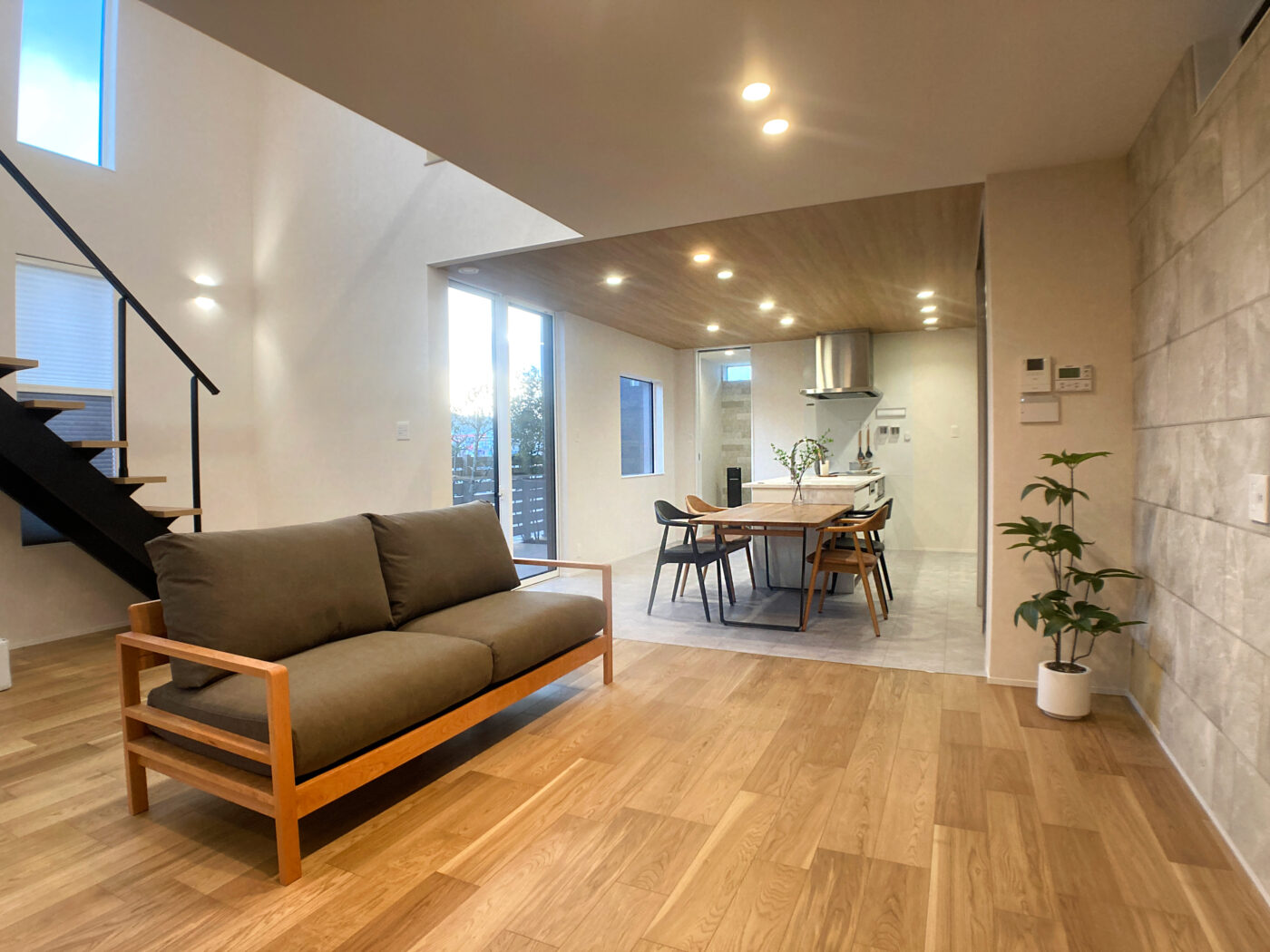 2026年1月17日にOPENされる(株)上杉工務店様の新しいモデルハウスへ家具コーディネート納品させて頂きました😄✨ 吹抜けの大空間は上下階の一体感が感じられ、リビング階段がアートの様でスタイリッシュ💫 寝室はヘッドボ