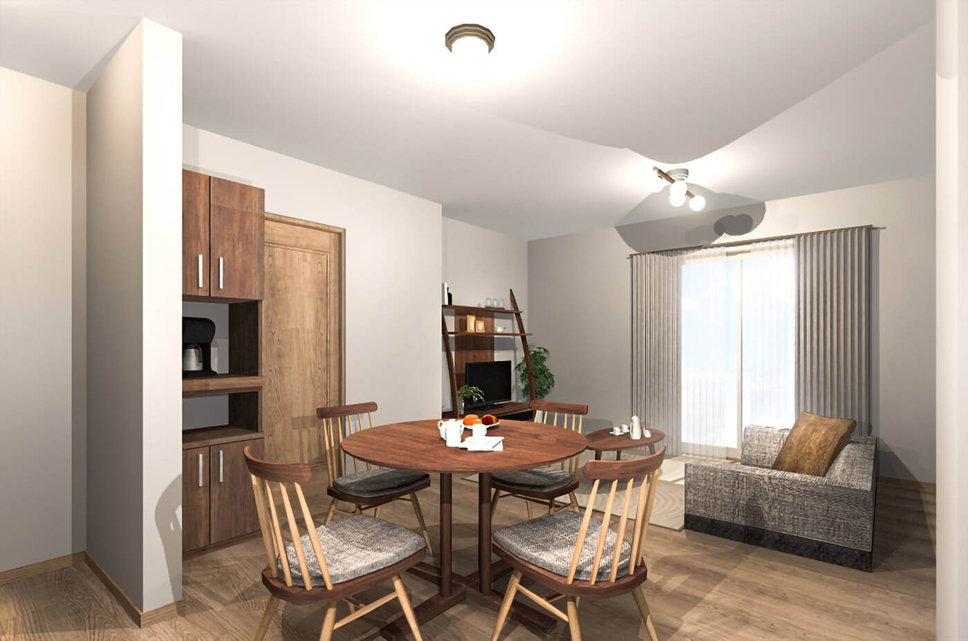 上質なウォールナットの家具で大人の落ち着いた空間としつつも、丸みのあるフォルムの天井照明で柔らかい空気感を演出させて頂きました(⌒∇⌒)