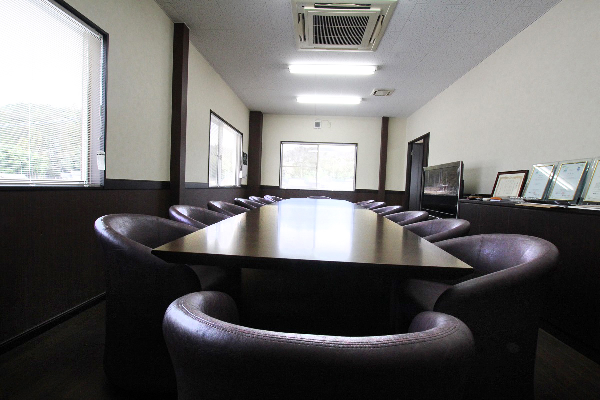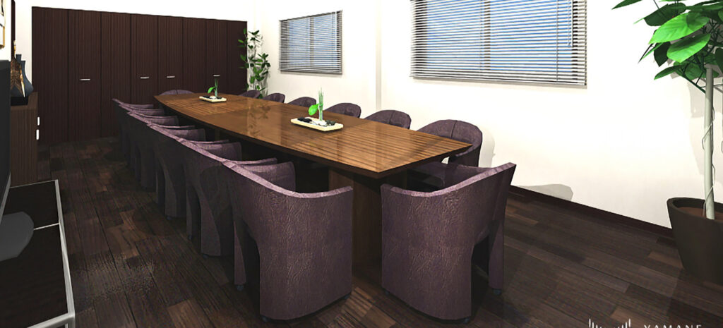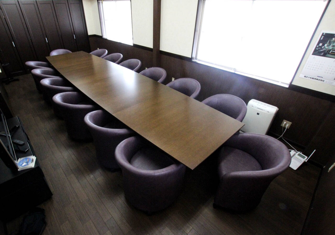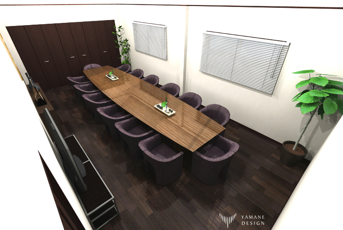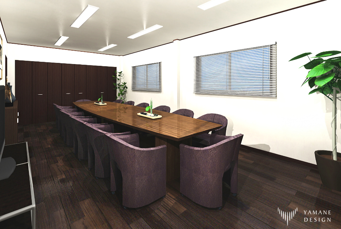役員用の会議室として14名集う事の出来る家具をコーディネートさせて頂きました。特大のW4,800MM舟形テーブルにどっしりとしたキャスター付きレザー張りソファに(#^.^#) 1人1人がゆったりと座ることができます。ありきたりの役員室はいらない・・・企業カラーである「パープル色」を採り入れ、全体的にダークトーンでまとめられた室内に彩を添えてます!特大のテーブルには天板の厚みが50MM以上ですが、出来るだけスタイリッシュにモダンに見せられるようテーパーカットが施してあります。ナラ材の突板張りで趣のあるテーブルです。創造性あふれる企業ならではの、壮大なプロジェクトがここから生まれてくると嬉しいです(^O^)/